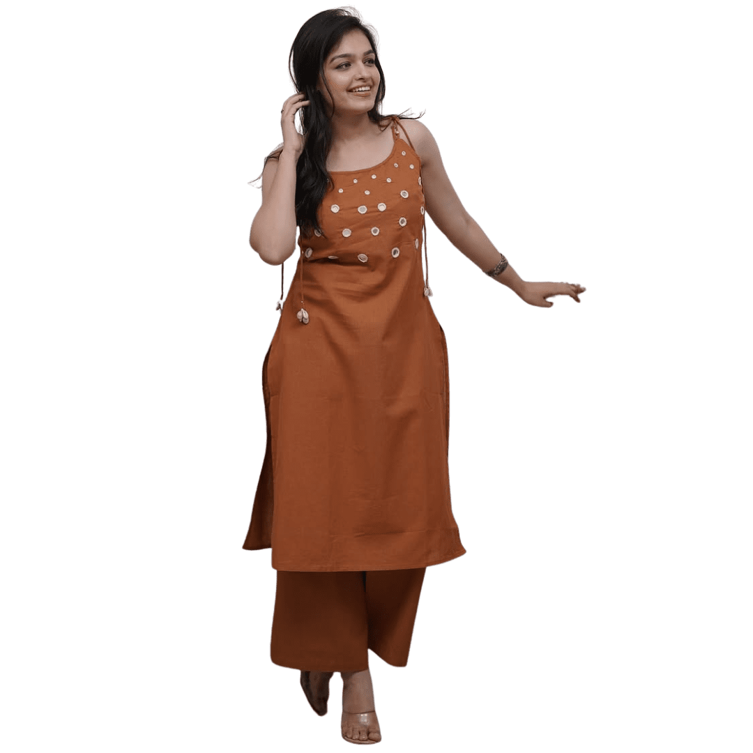 Add a warm, earthy elegance to your wardrobe with our Rust Bloom Co-Ord Set. Featuring a sleeveless kurta in a deep terracotta shade, adorned with delicate floral mirror work and playful tie-up tassels on the shoulders, this set pairs effortlessly with wide-legged bottoms. A perfect blend of comfort and festive flair, it’s ideal for daytime outings, casual gatherings, or cozy celebrations.