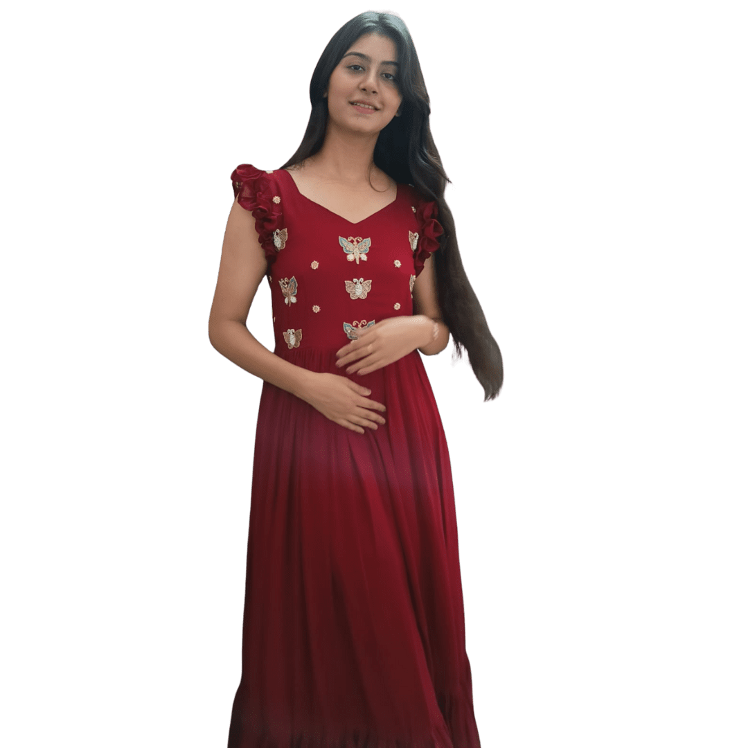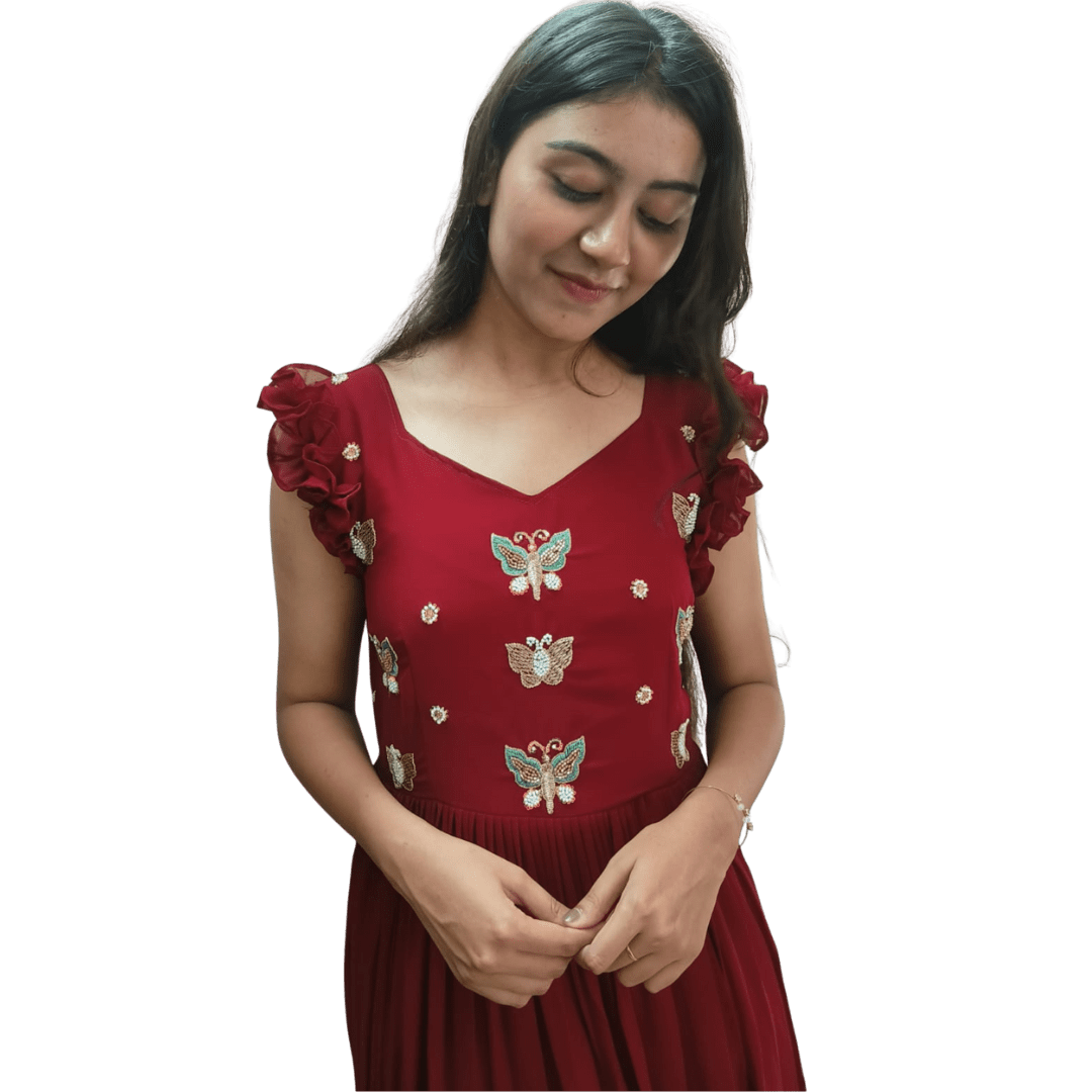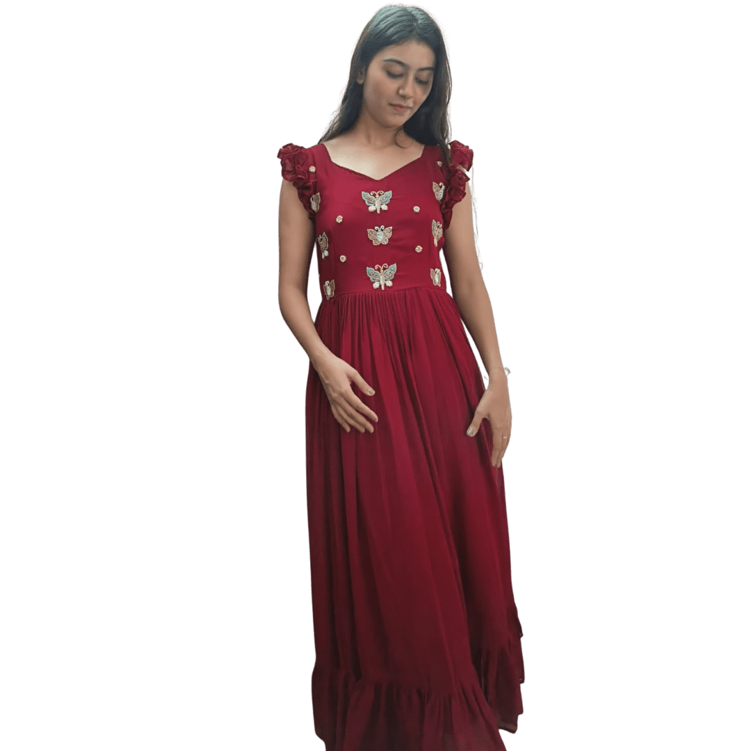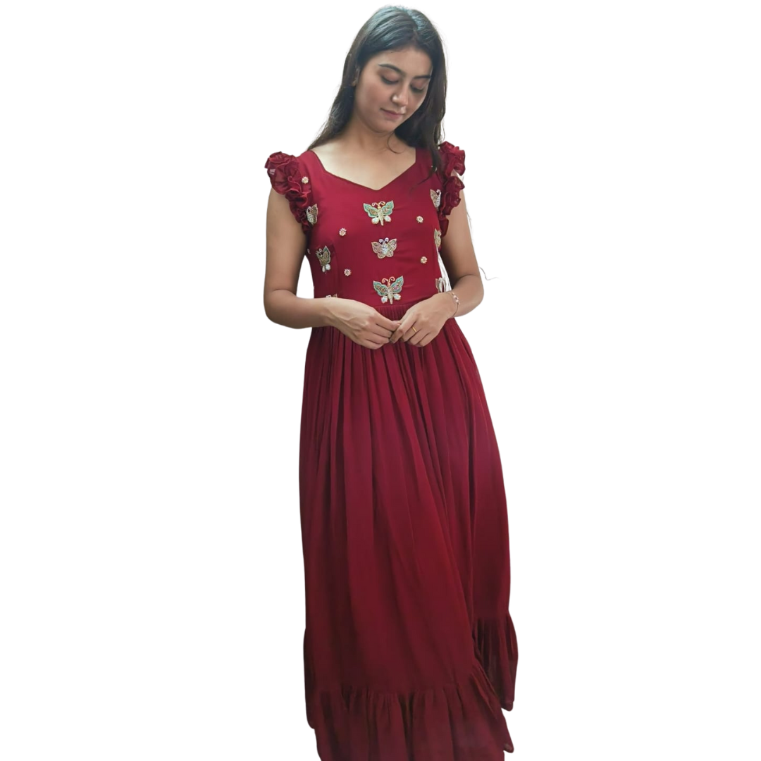 Turn heads with this stunning maroon gown, crafted to make you feel like a dream. The bodice features delicate butterfly embroidery paired with floral appliqué shoulders, adding a whimsical touch to its romantic design. The flowy, gathered skirt with a ruffled hem completes the look, making it perfect for parties, festive evenings, or special occasions.