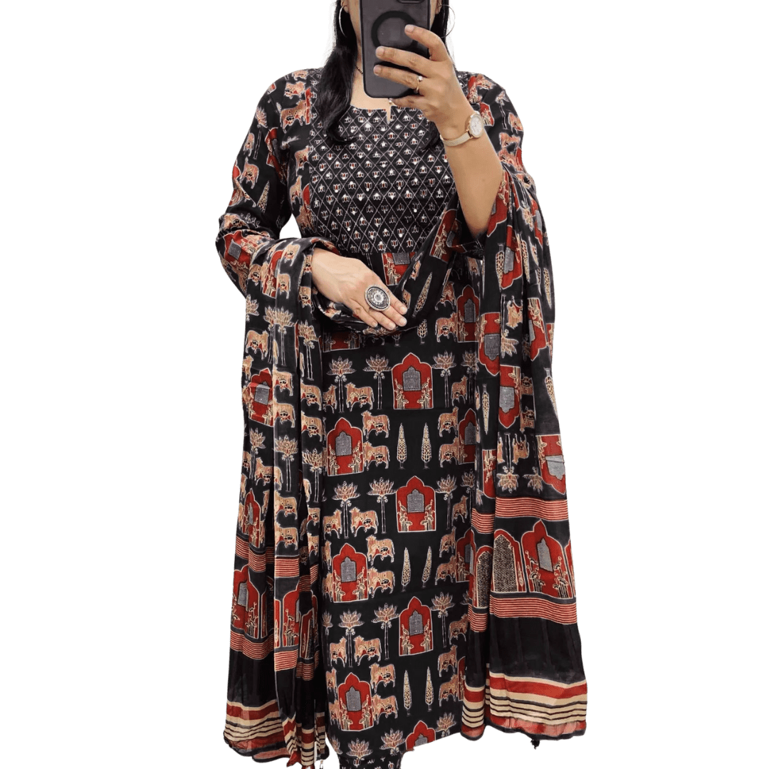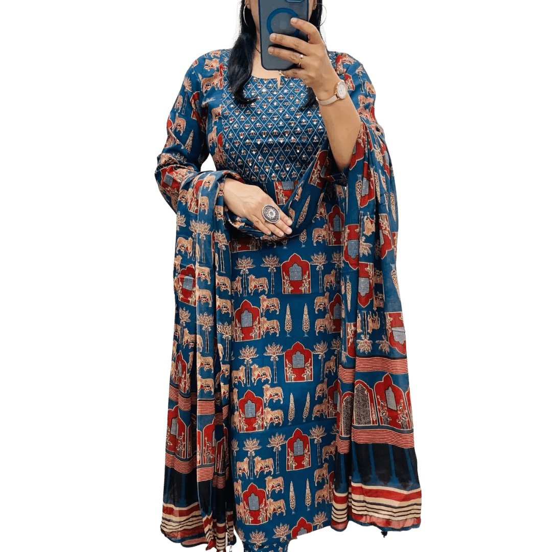 👉🏻 *Traditional Print Rayon kurti with pant and malmal dupatta*