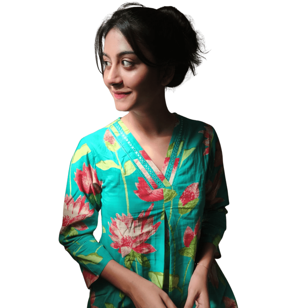 Add a refreshing burst of color to your wardrobe with our Lotus Bloom Cotton Co-Ord Set. Crafted from lightweight and breathable cotton, this vibrant turquoise set is adorned with bold lotus flower prints in shades of red, white, and green—perfect for both casual outings and relaxed days at home.