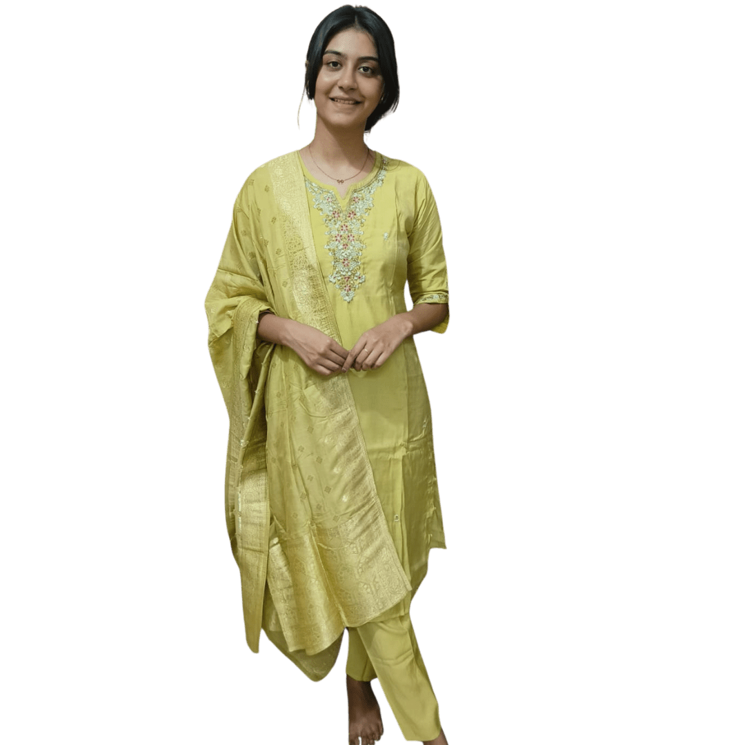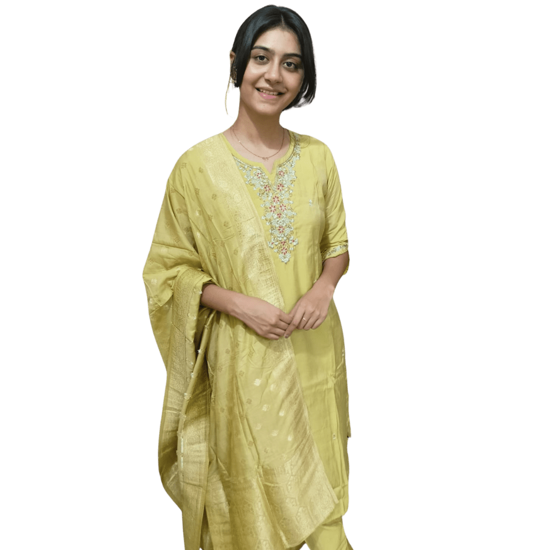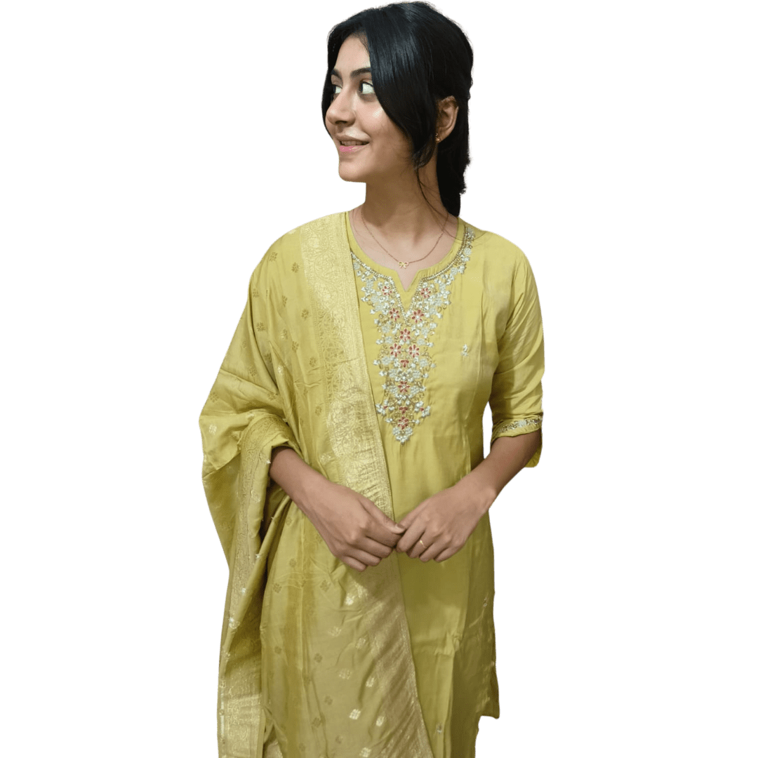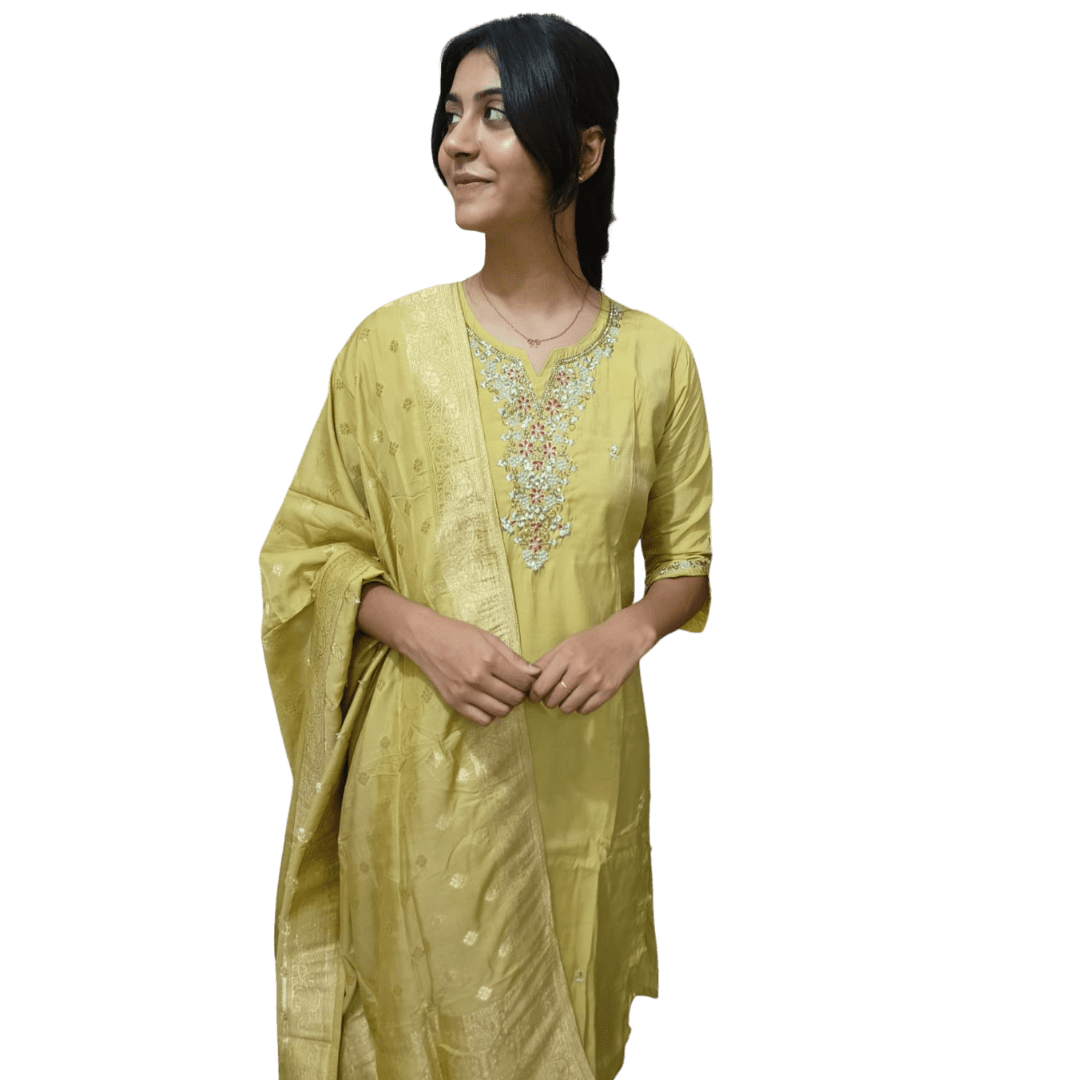 Step into timeless elegance with this beautifully crafted mustard yellow kurta set. Made from rich, soft fabric, the straight-cut kurta features intricate floral embroidery around the neckline and sleeves, adding a touch of sophistication to your everyday or festive wardrobe. Paired with a matching bottom and a stunning golden Banarasi dupatta adorned with traditional motifs and zari work, this ensemble blends tradition with modern charm.