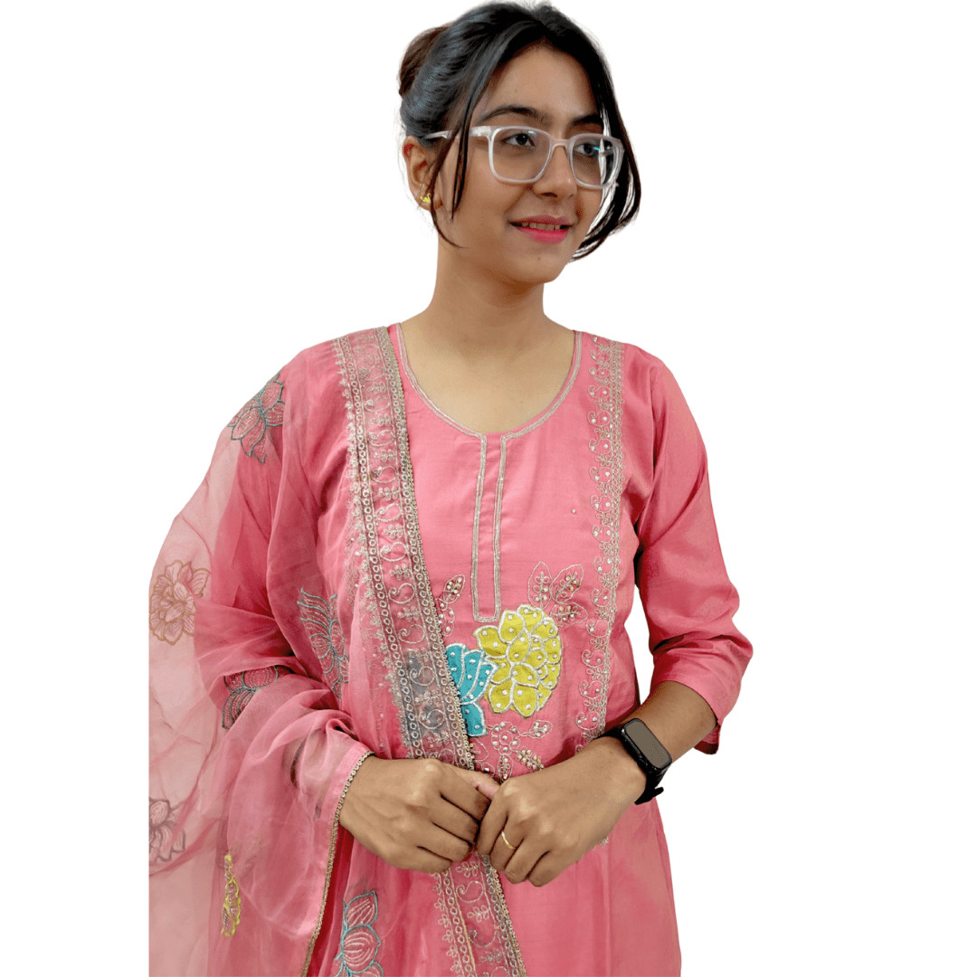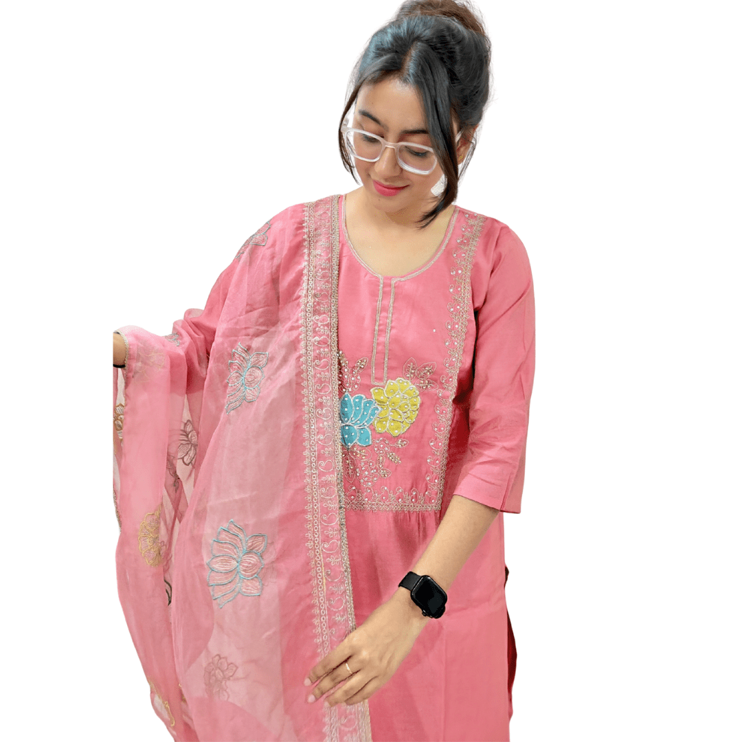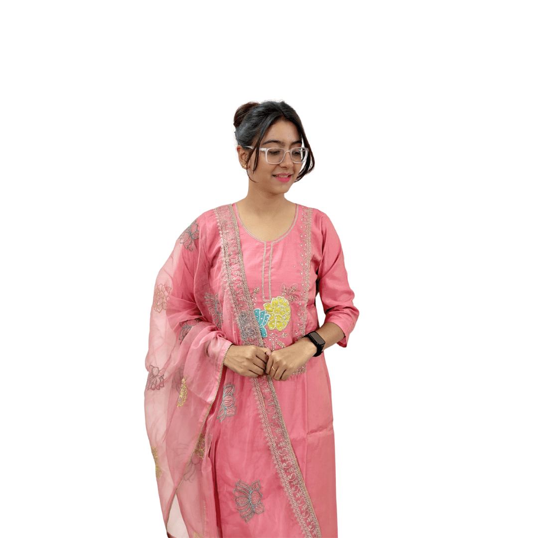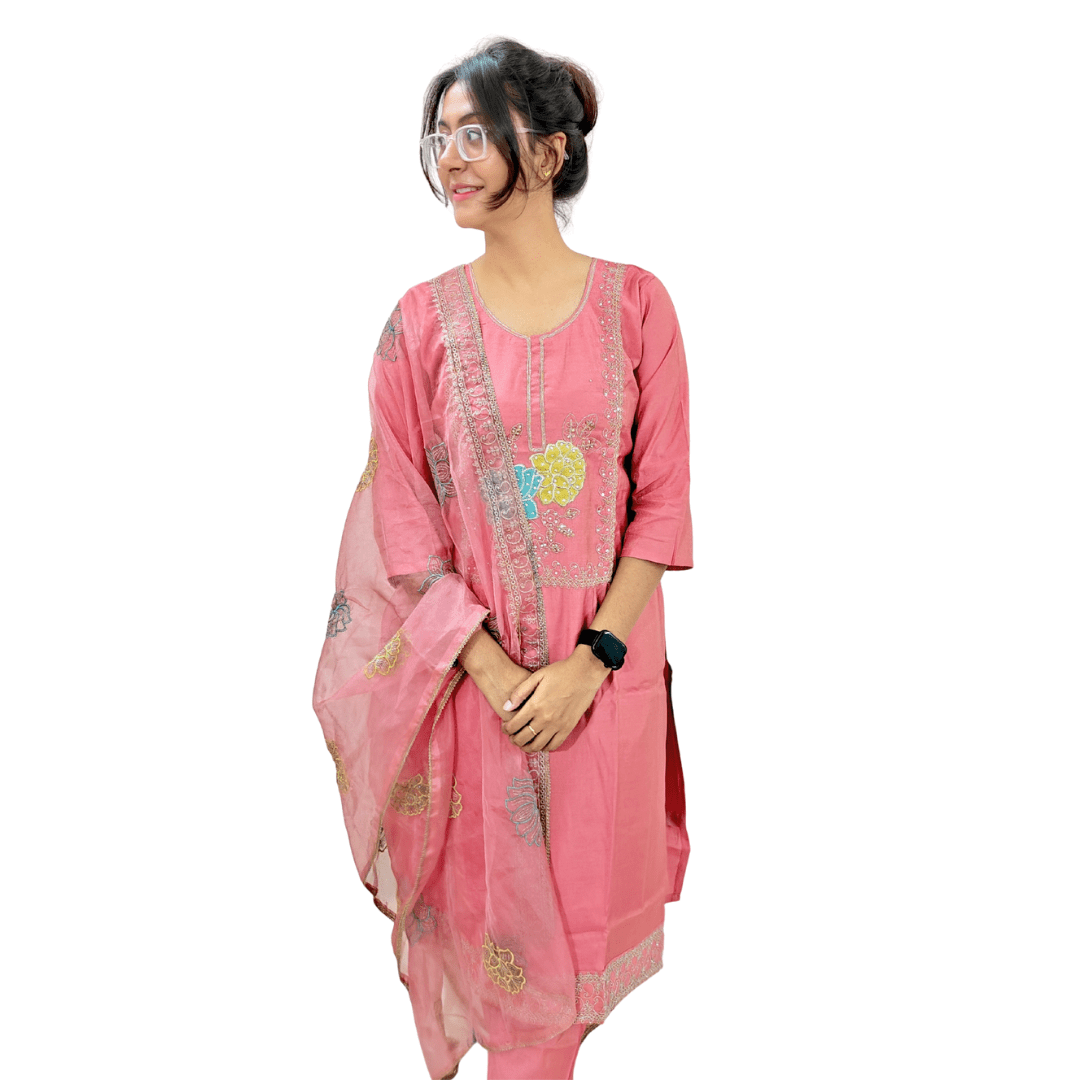 Step into effortless elegance with this soft pink cotton suit set, designed for both comfort and style. The straight-cut kurta features intricate floral thread and zari embroidery in pastel shades, adding a delicate yet eye-catching charm. Crafted from breathable, skin-friendly cotton, the kurta and bottoms are perfect for long hours of wear — whether at work, festive gatherings, or casual outings.